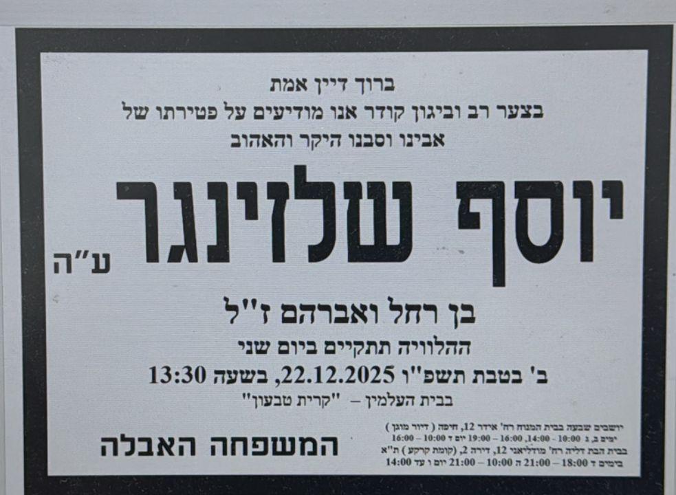 מודיעים בצער רב על פטירתו של שלוף (יוסף שלזינגר) ז"ל, מעמודי התווך של העמותה
