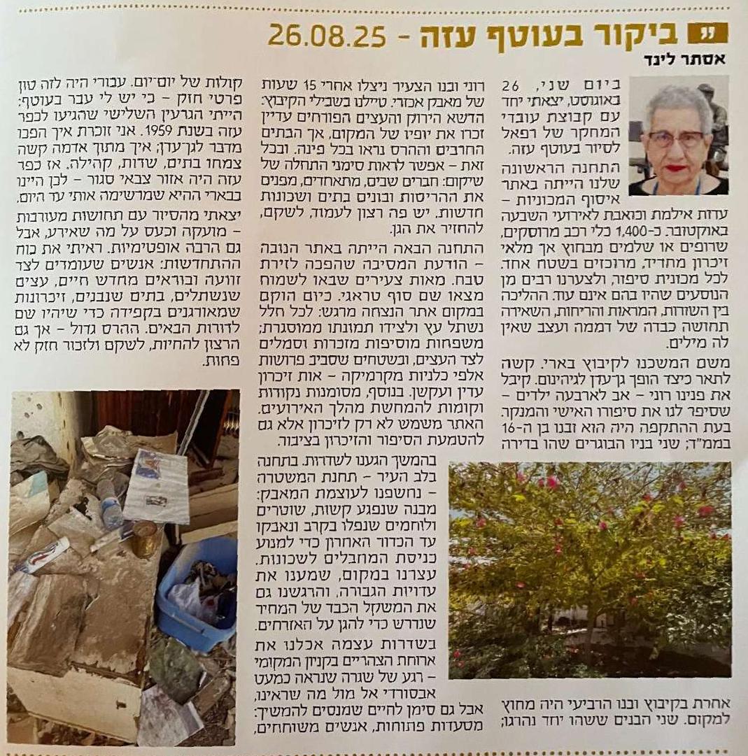 אסתר לינד, אלמנת חבר עמותה, כתבה רשמי סיור בעוטף, באירגון העמותה, בעתון של בית החולים "אלישע", בו היא מתנדבת
